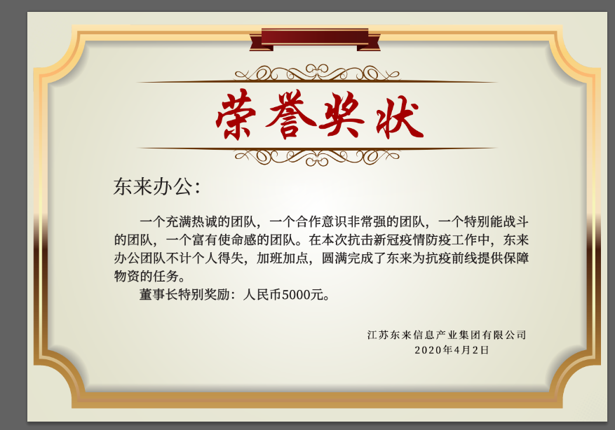 在抗擊新型冠狀病毒感染的肺炎疫情的戰(zhàn)斗中,東來(lái)辦公的全體同仁,假日無(wú)休,冒著風(fēng)險(xiǎn),完成各合作醫(yī)院的防疫物資供應(yīng),為此,集團(tuán)決定即時(shí)表彰東來(lái)辦公全體員工特別嘉獎(jiǎng),并獎(jiǎng)勵(lì)現(xiàn)金5000元。