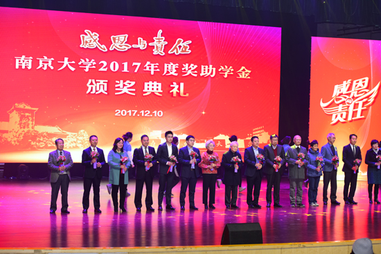 2017年12月10日上午,南京大學(xué)“感恩與責(zé)任”2017年度獎(jiǎng)助學(xué)金頒獎(jiǎng)典禮在仙林校區(qū)恩玲劇場(chǎng)舉行,二十余位校董、六十多家設(shè)獎(jiǎng)單位的頒獎(jiǎng)嘉賓,數(shù)十家企業(yè)代表和社會(huì)愛(ài)心捐贈(zèng)人,中科院院士、南京大學(xué)校長(zhǎng)陳駿,南京大學(xué)黨委常務(wù)副書記楊忠,南京大學(xué)副校長(zhǎng)薛海林、王志林,南京大學(xué)黨委常委、宣傳部部長(zhǎng)王明生,南京大學(xué)黨委常委、組織部部長(zhǎng)郭隨平,以及南京大學(xué)各部門、院系負(fù)責(zé)人、師生代表等一千余人出席典禮。